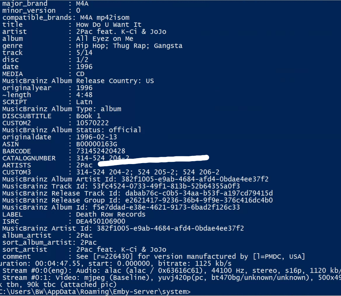 Happy2Play 9780 Posted June 4, 2021 Posted June 4, 2021 3 minutes ago, spon said: I think maybe the issue with Picard and Artists is limited to m4a file types. I removed all tags, retagged using Picard and the album info from @Happy2Play and my Picard results now look identical. However, when I load up the album in Emby it doesn't display any artists other than 2Pac. Then when checking ffprobe (and Tagscanner) they both show the Artists tag to be set to 2Pac, even though in Picard the Artists tag shows all the artists.I think maybe the issue with Picard and Artists is limited to m4a file types. I removed all tags, retagged using PIcard and the album info from @Happy2Play and my Picard results now look identical. However, when I load up the album in Emby it doesn't display any artists other than 2Pac. Then when checking ffprobe (and Tagscanner) they both show the Artists tag to be set to 2Pac, even though in Picard the Artists tag shows all the artists. Are you Refreshing metadata (not scanning) when you retag the media? I don't currently have any .m4a files so it can't be that. ffprobe results Spoiler C:\Users\Media\AppData\Roaming\Emby-Server\system>ffprobe -i file:"C:\Users\Media\Desktop\Videos\Music - emby metadata\2Pac\All Eyez on Me\CD 1/1-02 2Pac, Nate Dogg & Snoop Dogg - All About U.mp3" -threads 0 -v info -print_format json ffprobe version 4.3.0-emby_2021_02_27-g8f222573e9+634 Copyright (c) 2007-2021 the FFmpeg developers and softworkz for Emby LLC built with gcc 9.2.0 (Rev2, Built by MSYS2 project) { Input #0, mp3, from 'file:C:\Users\Media\Desktop\Videos\Music - emby metadata\2Pac\All Eyez on Me\CD 1/1-02 2Pac, Nate Dogg & Snoop Dogg - All About U.mp3': Metadata: album : All Eyez on Me artist : 2Pac, Nate Dogg & Snoop Dogg album_artist : 2Pac MusicBrainz Release Track Id: 32d91ebe-7cbe-48d4-9f7c-1129519b8233 disc : 1/2 encoder : Lame3.97 genre : Rap TSRC : USKO10403675 TMED : Digital Media TORY : 1996 publisher : eOne title : All About U track : 2/14 MusicBrainz Artist Id: 382f1005-e9ab-4684-afd4-0bdae4ee37f2/405528df-2632-4730-80fc-83e775a97651/f90e8b26-9e52-4669-a5c9-e28529c47894 artist-sort : 2Pac, Nate Dogg & Snoop Dogg TSO2 : 2Pac SCRIPT : Latn originalyear : 1996 BARCODE : 099923580522 MusicBrainz Album Type: album Artists : 2Pac/Nate Dogg/Snoop Dogg MusicBrainz Album Status: official MusicBrainz Album Release Country: US Acoustid Id : 943a262c-a14c-4f54-9c89-f06468141f0c MusicBrainz Album Id: 23bf456f-c05c-4738-b675-062f57396fa8 DISPLAY ARTIST : 2Pac, Snoop Doggy Dogg & Nate Dogg & Dru Down MusicBrainz Album Artist Id: 382f1005-e9ab-4684-afd4-0bdae4ee37f2 MusicBrainz Release Group Id: e2621417-9236-36b4-9f9e-376c416dc4b0 date : 2005-03-08 Duration: 00:04:36.98, start: 0.025056, bitrate: 321 kb/s Stream #0:0: Audio: mp3, 44100 Hz, stereo, fltp, 320 kb/s, Start-Time 0.025s Metadata: encoder : LAME3.97 Side data: replaygain: track gain - -9.599999, track peak - unknown, album gain - unknown, album peak - unknown, Stream #0:1: Video: mjpeg (Baseline), yuvj420p(pc, bt470bg/unknown/unknown), 500x500 [SAR 1:1 DAR 1:1], 90k tbr, 90k tbn, 90k tbc, Start-Time 0.025s (attached pic) Metadata: comment : Cover (front) }