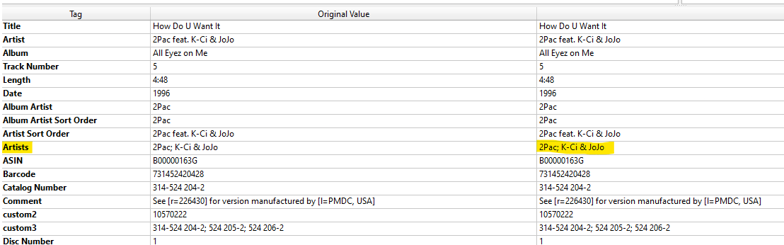 Happy2Play 9780 Posted June 4, 2021 Posted June 4, 2021 If you did not know there is 12 versions of that album and you would get slightly different results on each, primary difference is Year but are differences for track artist. As the AU version only shows 2Pac, like your example above.