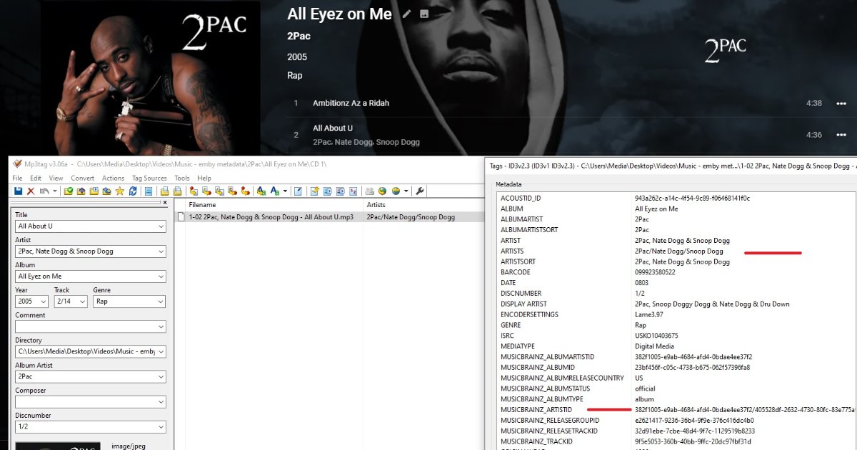 spon 26 Posted June 4, 2021 Author Posted June 4, 2021 4 minutes ago, Deathsquirrel said: This appears to be the same issue as That user also uses MusicBee as I recall. The short version is there are two problems. First, the \\ sting tells MP3Tag to put in a NULL character between text blocks. This isn't a valid separator for your IDv3 version. That is the separator for v2.4, not 2.3. Second, there is a FFProbe bug where it terminates reading the string when it encounters a NULL character. That's why you don't get multiple artists showing up. There are two fixes, both pretty simple. Rip to FLAC, FLAC tags don't have this issue. Switch your separator character. For ID3v2.3 that should be / though ; also works fine. As for tagging tools, I use picard for the basic collection and then clean it up in MP3tag. I'm pretty sure I could do it all in MP3tag, but I'm used to the two steps I run now. Thanks, this mirror my experience and oddly makes me happy that I'm not crazy. lol. In terms of the solutions, how certain are you that MusicBee is writing \\ as the separator? I ask because when I tag a song with multiple artists in MusicBee, it shows in their "Tag Inspector" as 2 (or more) separate Artist tags with one artist per tag. If I then open that file in Mp3Tag it does show one Artist tag with \\ as the separator. However if I open the same file in TagScanner, it also shows one Artist tag but with semicolon as the separator. So at that point I'm not sure which is true: 1. MusicBee is writing 2 Artist tags, each with a unique artist 2. MusicBee is writing 1 Artist tag using \\ as a separator but visually showing them as separate tags in their UI. Mp3Tag is correctly showing the one tag with \\ separator. TagScanner is incorrectly showing one tag with semi colon. 3. MusicBee is writing 1 Artist tag using semicolon as a separator but visually showing them as separate tags in their UI. Mp3Tag is incorrectly showing the one tag with \\ separator. TagScanner is correctly showing one tag with semi colon. To make things even more complicated, even when I only use Picard, I still have issues with some albums, as described on 2Pac's, All Eyez On Me album in an earlier post. Screenshots below to show that Picard has tagged Artists correctly, but ffprobe/Emby is only reading the first value. When testing these changes, I'm completely removing the album from the Emby watched folder and making the changes on another drive entirely. Then I'll move it back over to the emby music folder. Rescan to catch the album. I'll then refresh metadata if something is off, just to be sure.