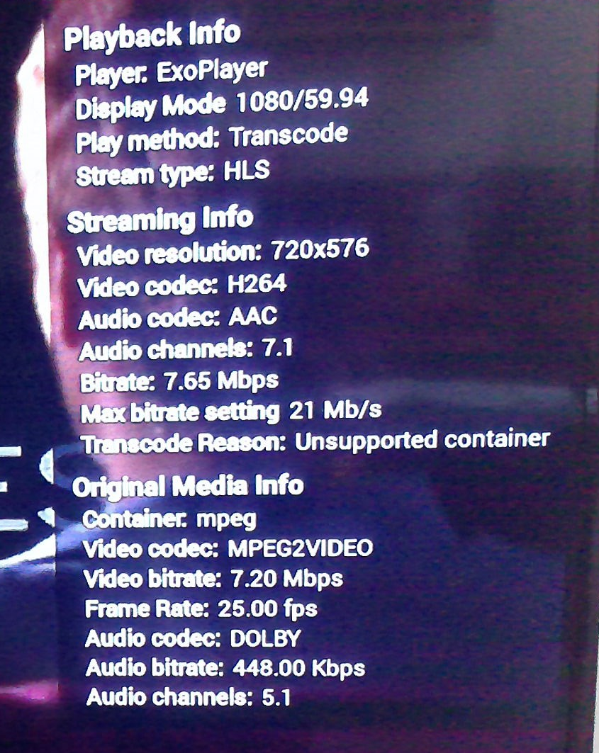 BillOatman 596 Posted May 30, 2021 Author Posted May 30, 2021 1 hour ago, ebr said: Only the channel count is off. It is transcoding to AAC because the HDMI connection must be reporting no support for Dolby Digital. It is the optical that is probably tripping it up here. I handbraked them all to mp4 from VOB and no transcoding at all now, so it stays dolby and 5.1. So it seems needing to transcode due to the container triggered the weirdness. The TV itself does not have dolby support but it passes it down to the soundbar via optical. The test files being played clearly demonstrate the 5.1 is getting there, so all is well