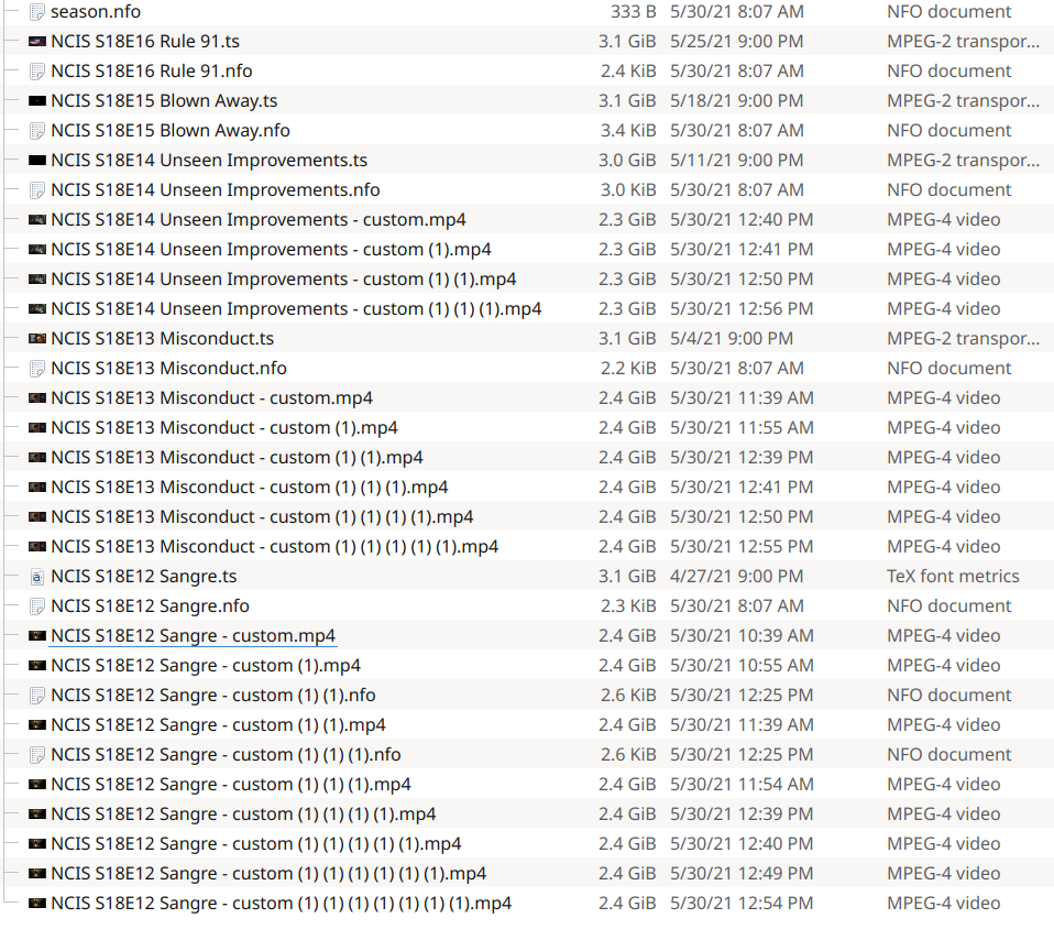 tortue 0 Posted May 30, 2021 Posted May 30, 2021 I'm having a strange issue with file conversions being copied to their destination after using the Convert feature within Emby. I have the below problem using the current 4.6.1 and previous version 4.5.4. Emmby Server on Ubuntu 20.04 Library is the Emby recordings library on a CIFS share (vers=3) mounted locally I have Emby recording shows with no issue. It can record, playback on various devices, and delete shows in the library. I decided to convert the transport streams I record (from the HDHomerun) into another format with more direct play support. For testing I chose the option to convert to "Original media folder, next to original files". The conversion occurs without any issue, and actually the transfer/sync occurs without any issue also, however the emberserver.txt log contains the attached error message about an 'Operation not permitted' and 'Access to the path is denied'. On the next sync/transfer task the converted file is copied again (with the (1) suffix added), I presume it treis again because the converted file is still in the converted/temporary folder since it did not confirm the copy completed successfuly during the prior transfer. This continues to occur, so I end up having numerous duplicated video files. A picture of the current file list is below. I've checked all the permissions, up and down the folder tree. The library is on a samba share mounted via fstab. I'm curious if there is a function call or something specific the transfer is trying to accomplish that is not allowed on cifs shares (or remote filesystems) or something else is going on, as the emby user has full (read/write/delete) access to the files and folders. I do have alternate data streams disabled on the file server, so maybe emby is attempting to check something there. I can watch each of the converted files with no issue through the emby interface, so the copies are intact and working. Any ideas? emby-log-entries.txt