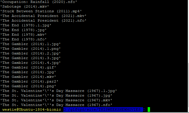 Westiewill007 2 Posted June 10, 2021 Author Posted June 10, 2021 westie@Ubuntu-1804-bionic /glftpd/site/THISWEEKSNEWMOVIES rm -rf The\ Gambler\ \(2014\)*.png westie@Ubuntu-1804-bionic /glftpd/site/THISWEEKSNEWMOVIES rm -rf The\ Gambler\ \(2014\)*.gif westie@Ubuntu-1804-bionic /glftpd/site/THISWEEKSNEWMOVIES rm -rf The\ Gambler\ \(2014\)*.jpg westie@Ubuntu-1804-bionic /glftpd/site/THISWEEKSNEWMOVIES removed the images, going to see what happens when it scrapes it again.