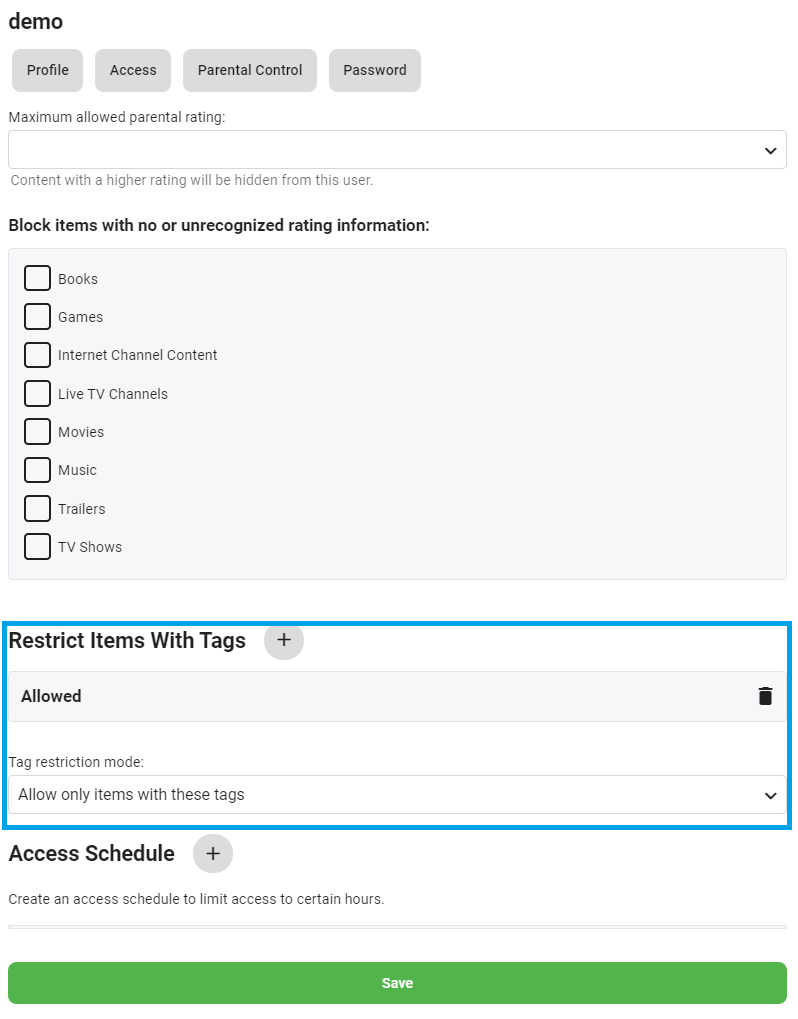 Blob 7 Posted June 16, 2021 Posted June 16, 2021 (edited) UPDATED: Added graphics to description Hi, I have configured an user and setup the following: Users -> <username> -> Parental Control -> Restrict Item With Tags: Allow only items with these tags When going into the Client (Observed with Web client), Live TV or any other Library under Tags, the user cannot see the Tags it has the permissions to see. Yes, the media Tagged with the Allowed Tags are visible. Is it expected behavior that the Tags are not visble for the user under the Tags menus when user is setup like this? Tag "Allowed" not visible - Why? Media/Channel with tag "Allowed" Thanks. Emby Server (Windows) Version 4.6.2.0 Webclient Edited June 29, 2021 by Blob no response on subject