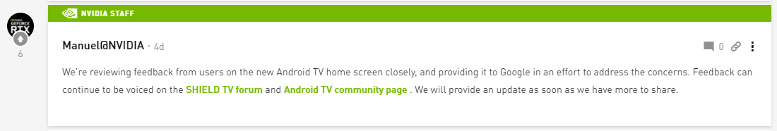 vdatanet 1617 Posted July 6, 2021 Posted July 6, 2021 2 minutes ago, CBers said: This was posted in one of the many threads on the Shield TV forums. https://www.nvidia.com/en-us/geforce/forums/shield-tv/9/457983/forcing-ads-on-your-users-bounty-for-customizati/3104750/ Google listening to feedback: 3