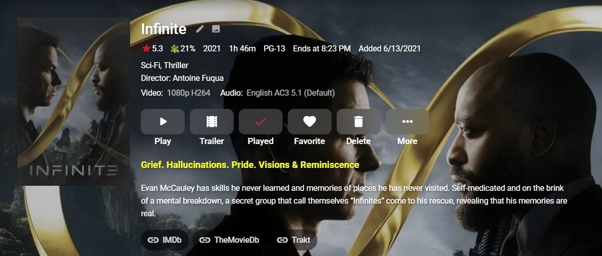 Happy2Play 9783 Posted June 22, 2021 Posted June 22, 2021 You obviously get TMDB rating from TMDB (similar to IMDB rating) ie <rating>. Now if OMDB is enabled also you could be using IMDBrating for <rating> and possibly get RT criticrating if present. Keyword here if present. Spoiler https://private.omdbapi.com/?apikey=fe53f97e&i=tt6654210&plot=short&tomatoes=true&r=json { "Title": "Infinite", "Year": "2021", "Rated": "N/A", "Released": "01 Jun 2021", "Runtime": "N/A", "Genre": "Sci-Fi, Thriller", "Director": "Antoine Fuqua", "Writer": "Ian Shorr (screenplay), Todd Stein (screen story), D. Eric Maikranz (book)", "Actors": "Sophie Cookson, Mark Wahlberg, Dylan O'Brien, Jason Mantzoukas", "Plot": "A man discovers that his hallucinations are actually visions from past lives.", "Language": "English", "Country": "USA", "Awards": "N/A", "Poster": "https://m.media-amazon.com/images/M/MV5BM2U3NTU4ZTQtNTE0Ny00M2NmLWFhODUtNjYxMDZkZTY3ODZhXkEyXkFqcGdeQXVyODgyODk3MzU@._V1_SX300.jpg", "Ratings": [{ "Source": "Rotten Tomatoes", "Value": "21%" } ], "Metascore": "N/A", "imdbRating": "N/A", "imdbVotes": "N/A", "imdbID": "tt6654210", "Type": "movie", "tomatoMeter": "N/A", "tomatoImage": "N/A", "tomatoRating": "N/A", "tomatoReviews": "N/A", "tomatoFresh": "N/A", "tomatoRotten": "N/A", "tomatoConsensus": "N/A", "tomatoUserMeter": "N/A", "tomatoUserRating": "N/A", "tomatoUserReviews": "N/A", "tomatoURL": "https://rottentomatoes.com/m/infinite", "DVD": "10 Jun 2021", "BoxOffice": "N/A", "Production": "N/A", "Website": "N/A", "Response": "True" }