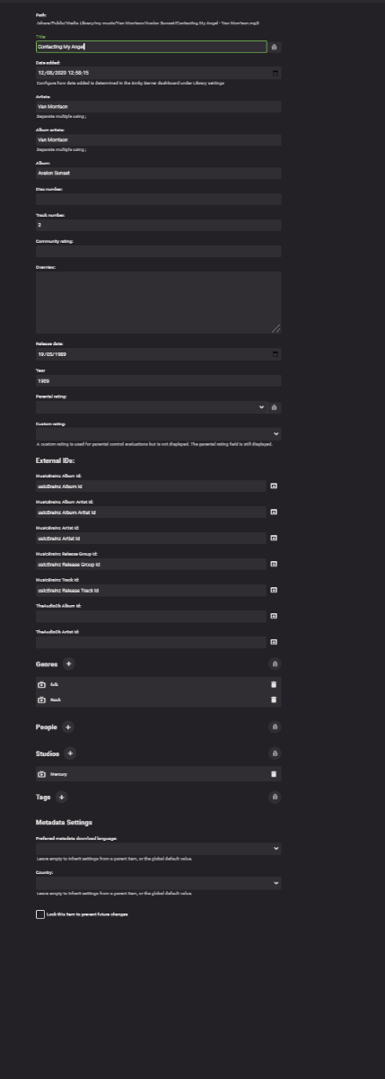 ramseyn 15 Posted June 24, 2021 Posted June 24, 2021 I have an album showing in my music library that doesn't exist at all in my actual music folders. It seems to contain hundreds of tracks from all over my actual folders, none of which reference it at all as the album they are one. The common denominator seems to be that all the MusicBrainz metadata fields are missing the leading "M" for MusicBrainz (tat is, there are no actual MusicBrainz IDs, but instead text that says, for example "usicBrainz Album Id" in the Album Id field. I can't delete this album anywhere either on the folders themselves (because it doesn't exist) or anywhere in Emby. I can remove songs one at a time by going into their metadata and deleting the entries in all MusicBrainz fields, but that is going to take days with hundreds of songs - possibly thousands, I haven't counted, just scrolled through page after page of them. How can I delete this non-existent album?