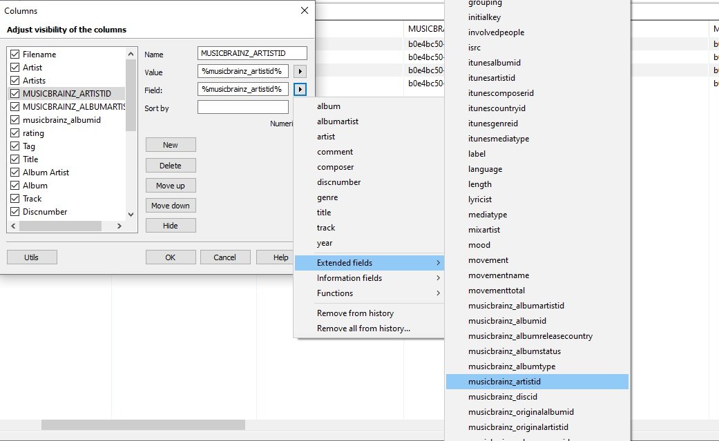 ramseyn 15 Posted June 24, 2021 Author Posted June 24, 2021 OK, but it doesn't quite show for me the way it does for you. If I open column visibility, the MusicBrainz tags are not in the list. THey appear on the tag panel if I go into options->Tag Panel. However that only allows them to be created as field with a name. Your image shws associating those fields with tag placeholders ("SICBRAINZ_ARTISTID% in your screenshot, which I assume to be %MUSICBRAINZ_ALBUMARTISTID% if shown in full). I don't get the option to associate that placeholder in my MP3TAG Column Visibility dialog. I have "musicbrainz artist id" in the list and if I select it I get %musicbrainz artist id% as I might expect. However there is no %MUSICBRAINZ_ARTISTID% option. (And there are two %musicbrainz artist id% entries). Note the difference here - the field MUSICBRAINZ_ARTISTID has an underscore, whereas %musicbrainz artist id% has two spaces.