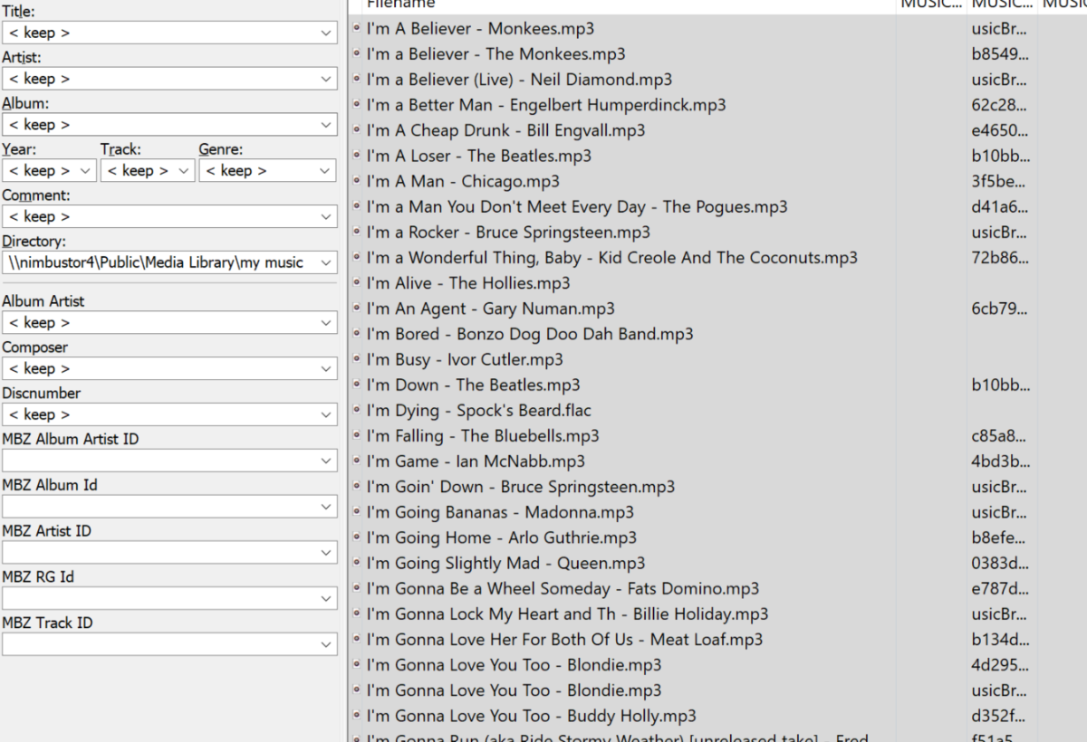 ramseyn 15 Posted June 25, 2021 Author Posted June 25, 2021 (edited) 17 hours ago, Deathsquirrel said: You may wish to look into why you can't delete the tags or not, blank is fine too if you don't use them. MUSICBRAINZ tags will be used if they are present. They aren't required. For tracks to show in a common album they need the Album and Album Artist tags populated correctly. If you have MUSICBRAINZ tags then their album and album artist tags also need to match. As others have said, if you have a 'USICBRAINZ' tag your tags are hosed up. Delete them and retag the file. I think I was suffering brain overload yesterday and not completely understanding. This morning looking at it fresh, I realised better what you were saying. I could see the MBZ tags at the far right column (way off my screen) when I scrolled to far right. Then I could use the column headers to sort by the various MBZ tags, highlight all the ones that had values, Alt-T for extended tags, and delete the dodgy ones. Not all issues are resolved - there appears to be an ARTISTS field that has "rtists" in it on some tracks. Currently cleaning all that up and I have now set ALL MBZ fields to <blank> - not just the ones with dodgy values but even the ones with correct MBZ values in them. When this has all saved, I should have NO MBZ tags anywhere in any track. That's just completed so I shall scan the library, refresh the metadata and see what happens. ... I have reached a daily post limit so editing this one. Re-scanned the library, didn't refresh metadata as I thought i would see what the effect had been. All duplicate artists seem to have vanished. I haven't looked for the non-existent album that started all this, but the fact duplcate artists have gone has to be a very encouraging indicator... Edited June 25, 2021 by ramseyn 2