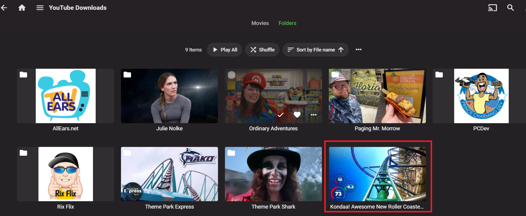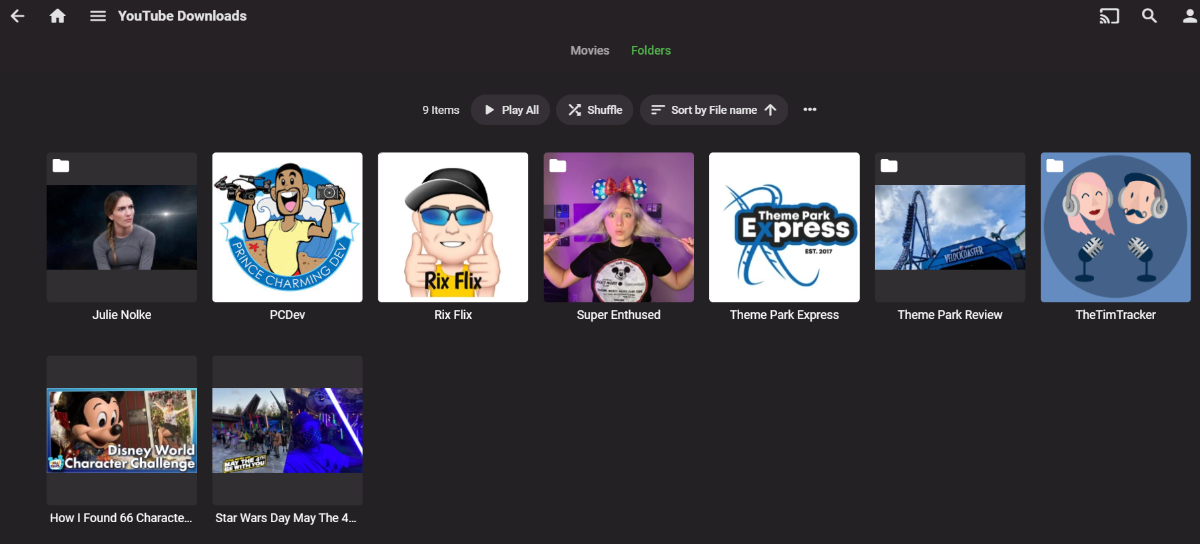 jriker1 21 Posted November 7, 2021 Author Posted November 7, 2021 (edited) I have a folder called YouTubeShows which I point Emby to. Then in there is a list of YouTubers Folders: So note I had one there called The Tim Tracker and watched the last one a few minutes ago. When I deleted that file, the folder is gone. It will be recreated the next time my downloader finds a new upload from them and stick the video in it. The actual video filenames are whatever they are from the site and I drop in a nfo file as well as part of the download. So for example for AllEars.net: Never really expecting Emby to do anything with it though it creates a poster file for each. There is a thumbnail stored in the MKV. Note here is what the "group" looks like at least from the Emby Website: Now if I go into one of those folders and delete all but one video and the original Poster file: I I guess you can say that folder goes away in the interface, the poster file isn't used, and it switches to just the video and a thumbnail from the video: Edited November 7, 2021 by jriker1
