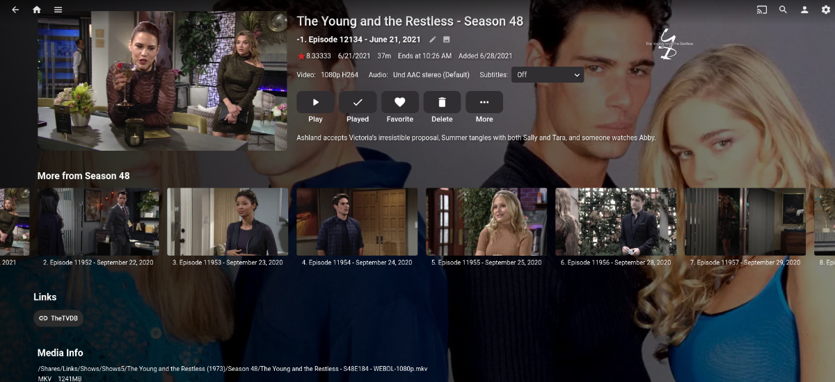 syralk 13 Posted July 8, 2021 Posted July 8, 2021 (edited) Hi it seem that some videos are not found in emby its happen when I have a show with alot of episodes in one season 2 shows to that so far The Young and the Restless (1973) and The Bold and the Beautiful (1987) both of them have more then 150 episodes. if I take the example of The Young and the Restless (1973) the last episode found is 177 and on of the missing one is label as episode -1 then the rest is not present This is the files list from 183 to the 195 'The Young and the Restless - S48E183 - WEBDL-1080p.nfo' 'The Young and the Restless - S48E183 - WEBDL-1080p-thumb.jpg' 'The Young and the Restless - S48E184 - WEBDL-1080p.mkv' 'The Young and the Restless - S48E184 - WEBDL-1080p.nfo' 'The Young and the Restless - S48E184 - WEBDL-1080p-thumb.jpg' 'The Young and the Restless - S48E185 - WEBDL-1080p.mkv' 'The Young and the Restless - S48E185 - WEBDL-1080p.nfo' 'The Young and the Restless - S48E185 - WEBDL-1080p-thumb.jpg' 'The Young and the Restless - S48E186 - WEBDL-1080p.mkv' 'The Young and the Restless - S48E186 - WEBDL-1080p.nfo' 'The Young and the Restless - S48E186 - WEBDL-1080p-thumb.jpg' 'The Young and the Restless - S48E187 - WEBDL-1080p.mkv' 'The Young and the Restless - S48E187 - WEBDL-1080p.nfo' 'The Young and the Restless - S48E187 - WEBDL-1080p-thumb.jpg' 'The Young and the Restless - S48E188 - WEBDL-1080p.mkv' 'The Young and the Restless - S48E188 - WEBDL-1080p.nfo' 'The Young and the Restless - S48E188 - WEBDL-1080p-thumb.jpg' 'The Young and the Restless - S48E189 - WEBDL-1080p.mkv' 'The Young and the Restless - S48E189 - WEBDL-1080p.nfo' 'The Young and the Restless - S48E189 - WEBDL-1080p-thumb.jpg' 'The Young and the Restless - S48E190 - WEBDL-1080p.mkv' 'The Young and the Restless - S48E190 - WEBDL-1080p.nfo' 'The Young and the Restless - S48E190 - WEBDL-1080p-thumb.jpg' 'The Young and the Restless - S48E191 - WEBDL-1080p.mkv' 'The Young and the Restless - S48E191 - WEBDL-1080p.nfo' 'The Young and the Restless - S48E191 - WEBDL-1080p-thumb.jpg' 'The Young and the Restless - S48E192 - WEBDL-1080p.mkv' 'The Young and the Restless - S48E192 - WEBDL-1080p-thumb.jpg' 'The Young and the Restless - S48E193 - WEBDL-1080p.mkv' 'The Young and the Restless - S48E193 - WEBDL-1080p-thumb.jpg' 'The Young and the Restless - S48E194 - WEBDL-1080p.mkv' 'The Young and the Restless - S48E194 - WEBDL-1080p.nfo' 'The Young and the Restless - S48E194 - WEBDL-1080p-thumb.jpg' 'The Young and the Restless - S48E195 - WEBDL-1080p.mkv' 'The Young and the Restless - S48E195 - WEBDL-1080p.nfo' 'The Young and the Restless - S48E195 - WEBDL-1080p-thumb.jpg' Edited July 8, 2021 by syralk