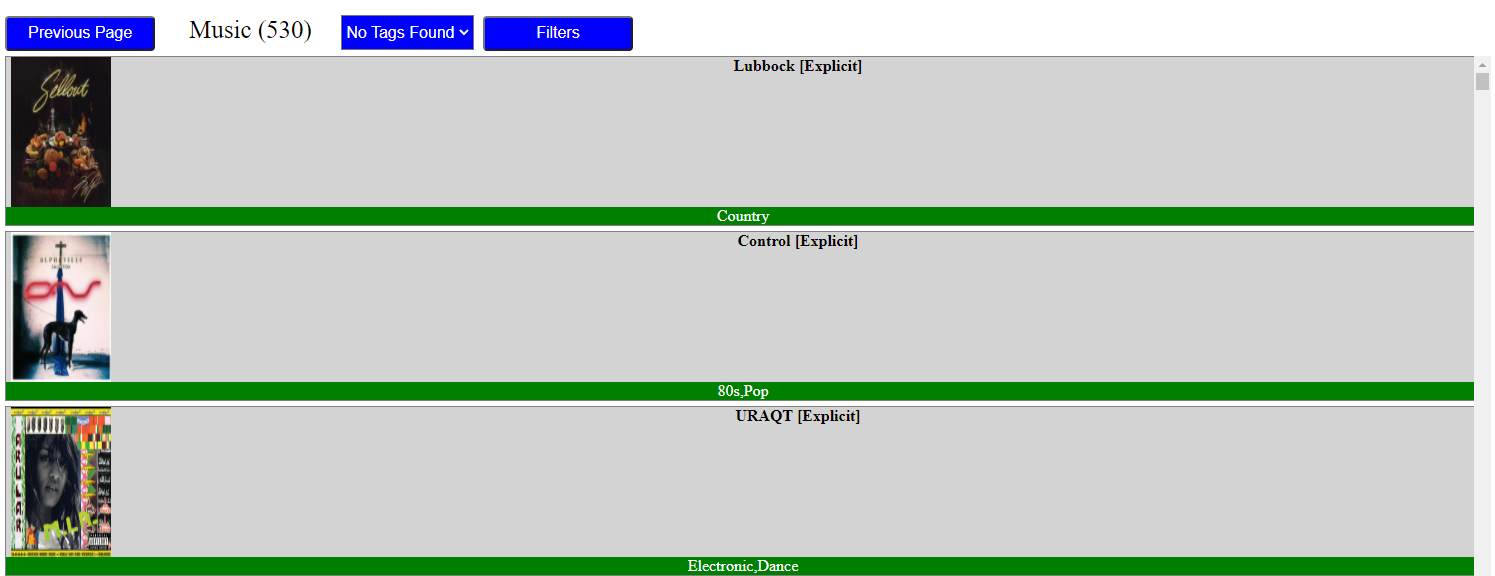 Happy2Play 9780 Posted January 3, 2022 Posted January 3, 2022 @VicMoore @mbarylski I figured it out looking at the query. From library level filter it has "Filters=IsFolder" and from Artist it does not. music library query Quote http://localhost:8097/emby/Users/{userid}/Items?Recursive=true&ParentId={parentid}&Fields=Genres,ParentId,Tags&Filters=IsFolder&Recursive=true&SearchTerm=[Explicit] query within Artist folder Quote http://localhost:8097/emby/Users/{userid}/Items?Recursive=true&ParentId={parentid}&Fields=Genres,Overview,Tags&Recursive=true&SearchTerm=[Explicit] So from library you have apply "is not folder" filter also to get what you want. 1