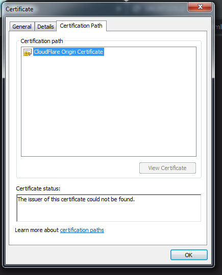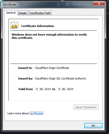 crusher11 1101 Posted July 12, 2021 Author Posted July 12, 2021 7 minutes ago, vdatanet said: I have no experience with Cloudflare because I use Nginx, but it looks like the browser connects directly to the server instead of using the Cloudflare proxy. Cloudflare origin certificate certificate is not trusted - Security - Cloudflare Community Because we changed CloudFlare from proxied to DNS only. I changed it back. https://domain is still not secure, but now it says the certificate is valid.