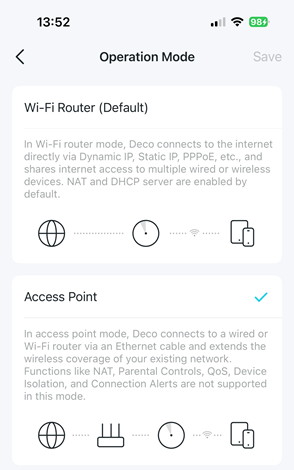 The following is an example for a TP-Link Deco M9 Plus Mesh Network. The Deco mobile app has in Advanced Settings an option for changing the operation mode.