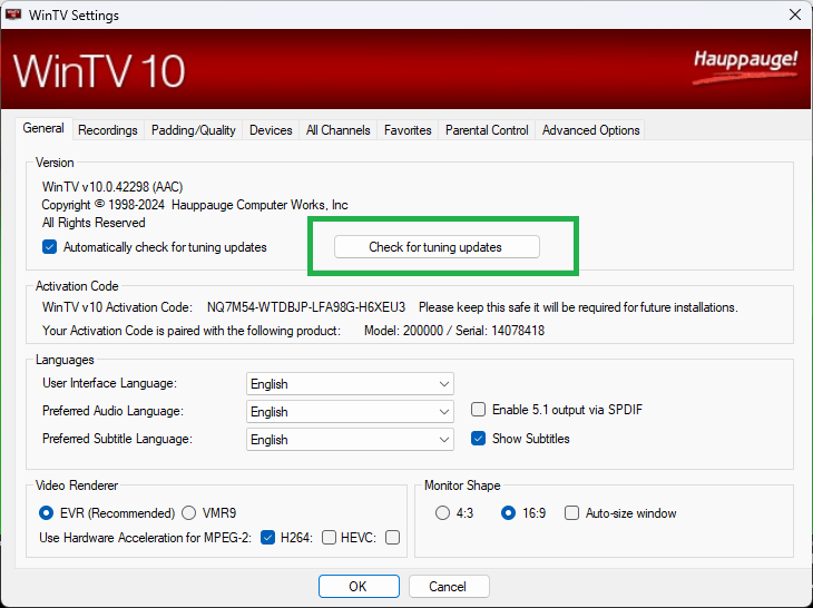 After installing the Hauppauge WinTV app, ensure all the channel tuning data is updated, click on Settings and then Check for Tuning Updates in the General tab.