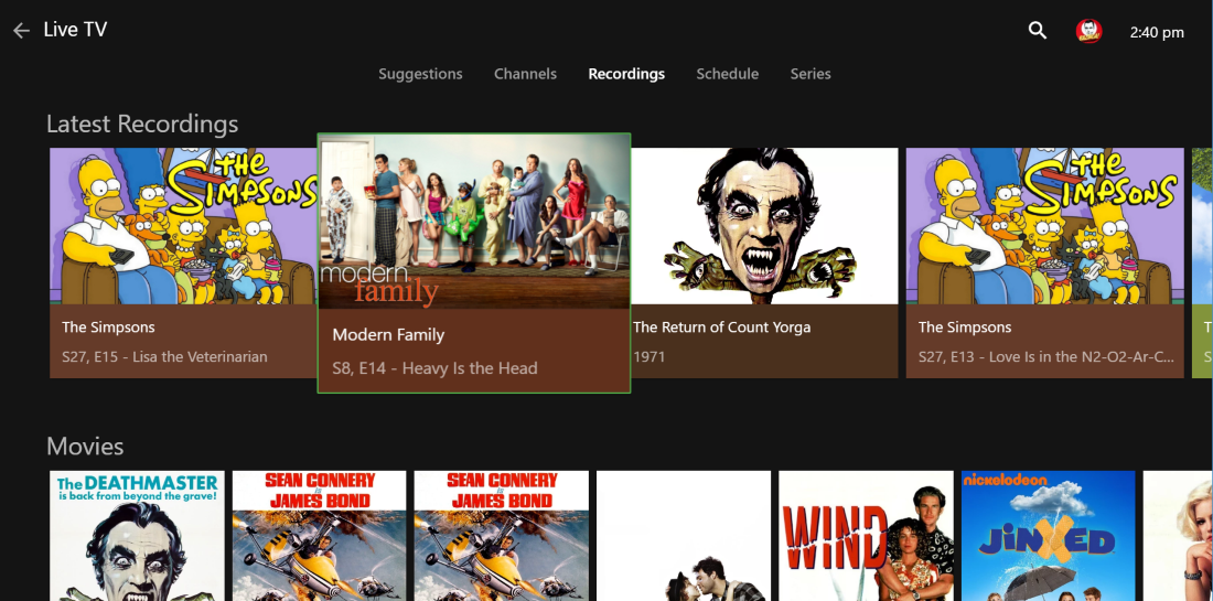 Designed with with typical usage in mind, you won’t have to go hunting through your library to find the content you are most likely wanting to watch right now. The home screen shows you the items you were watching but hadn’t finished, your latest un-watched movies, the next episode of all your current TV shows and what’s on Live TV right now.